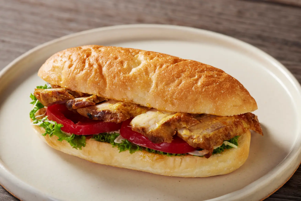 スパイスに漬け込んだ鶏肉をじっくり焼き上げ、香り高く仕上げている。スパイシーな香りが食欲を誘う、寒い日にうれしいサンド。